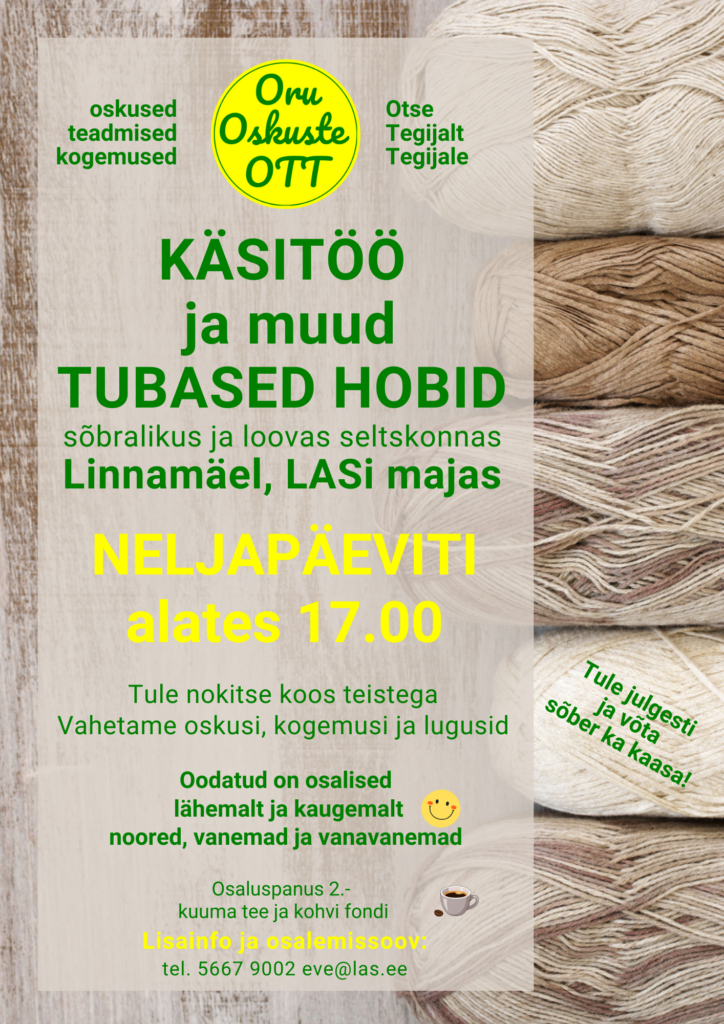 Viimastel tubastel talvekuudel jätkub Linnamäel, LASi maja hubases peeglisaalis taas Oru OSKUSTE OTT ehk Otse Tegijalt Tegijale erinevate oskuste jagamine ja selle käigus uue õppimine.