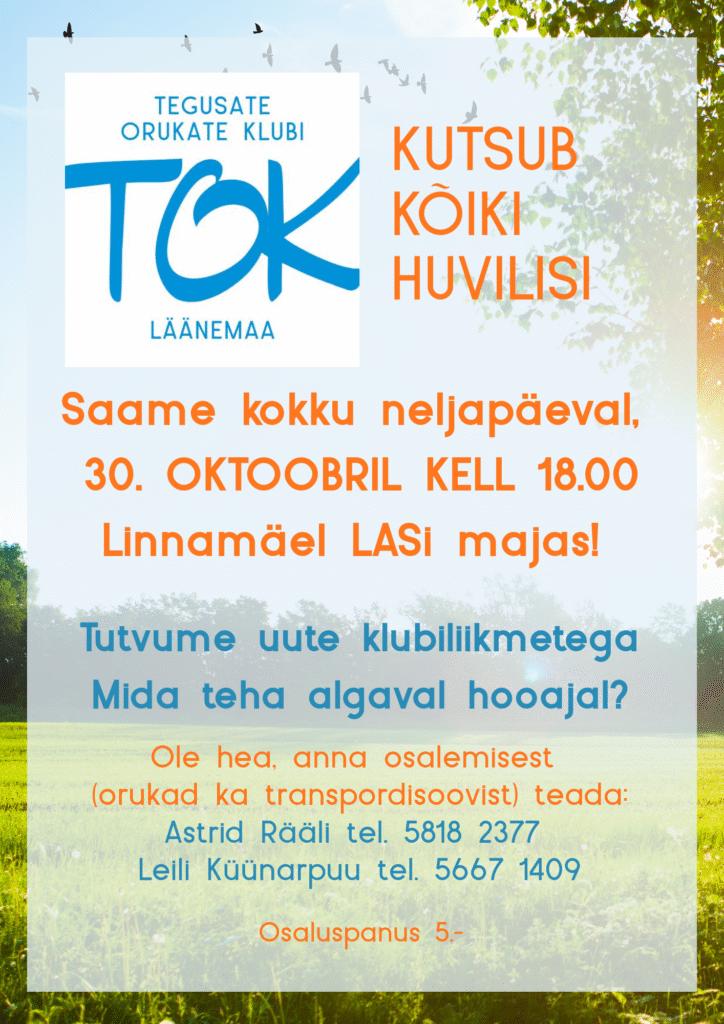 🍁30. oktoobril kell 18.00 alustab Linnamäel, LASi majas uue hooajaga Tegusate Orukate Klubi. Loe lisa SIIT Ole hea, anna osalemisest (orukad ka transpordisoovist) teada: Astrid Rääli tel. 5818 2377, Leili Küünarpuu tel. 5667 1409