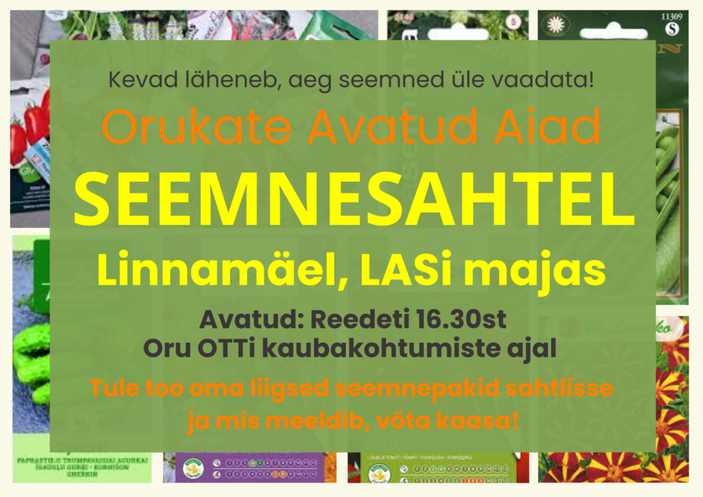 Kevad vaikselt läheneb ning Orukate Avatud Aedade aednikud kutsuvad oma seemnekarpe üle vaatama. Kui miskit oma tarbest üle, võib pakid tuua Linnamäele LASi majja mõnd teist rohenäppu rõõmustama!