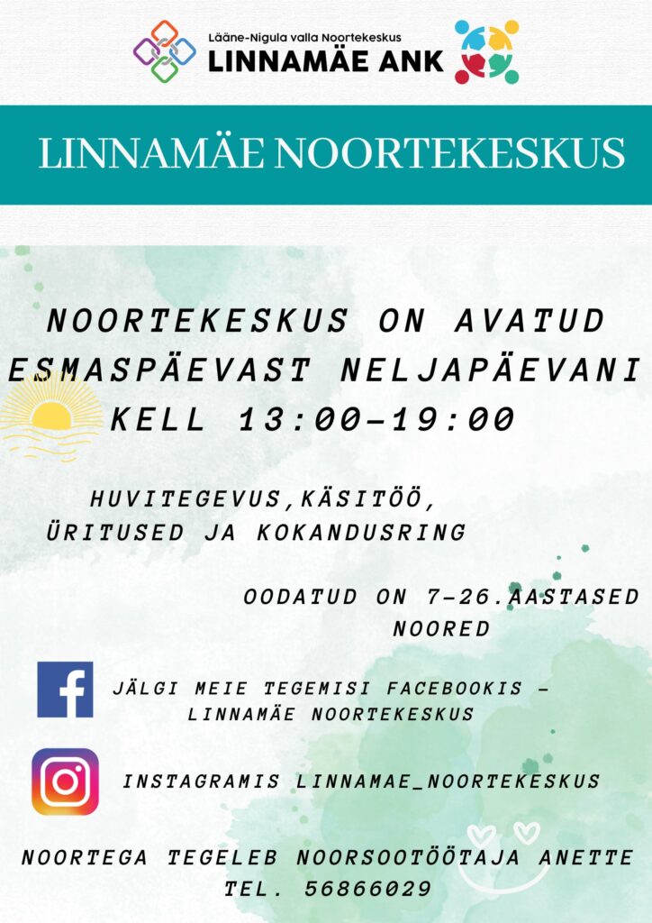 Linnamäe Noortekeskus – avatud E-N 13-19 juhendaja Piret Loorits, tel.5906 0769.